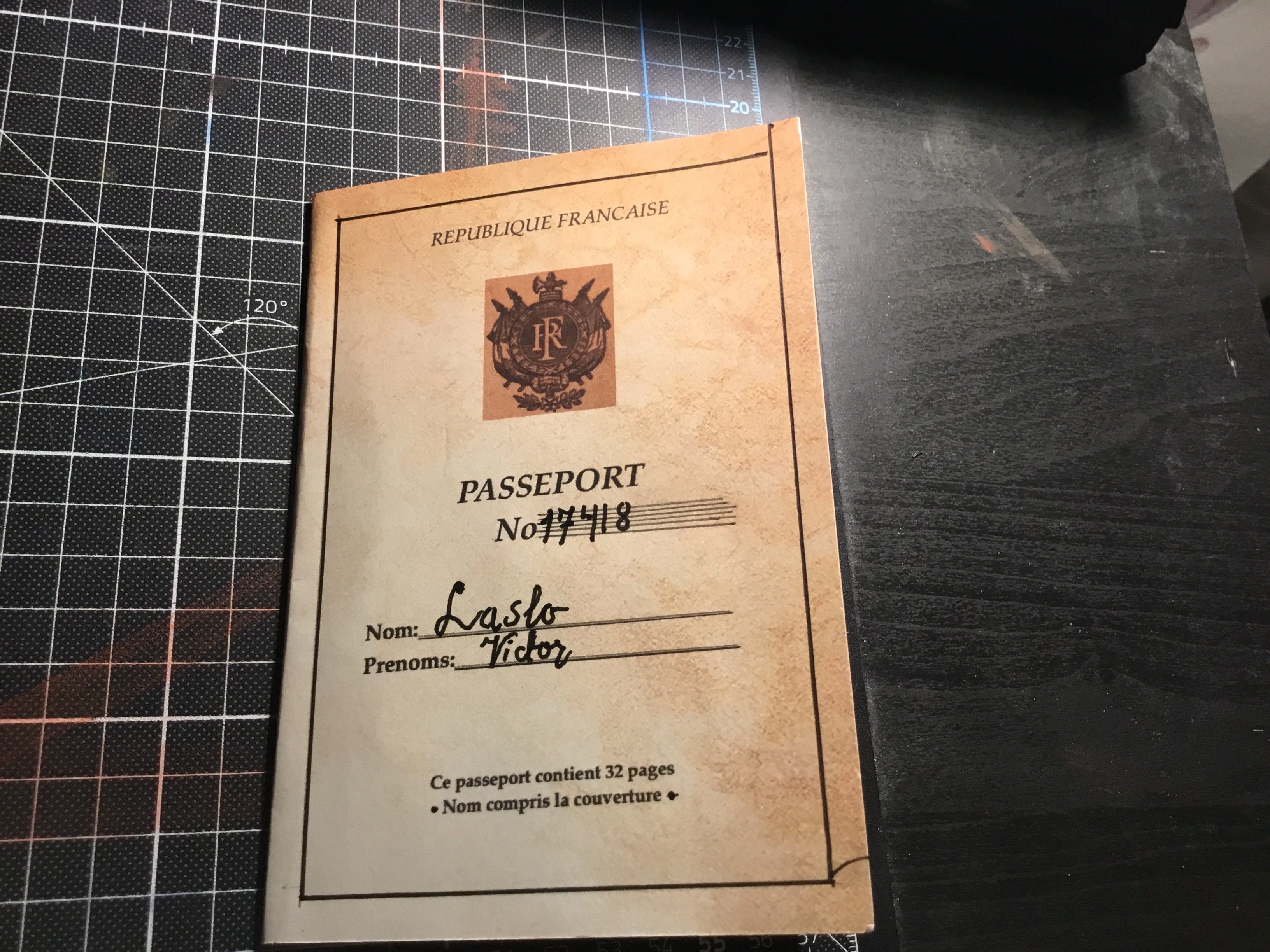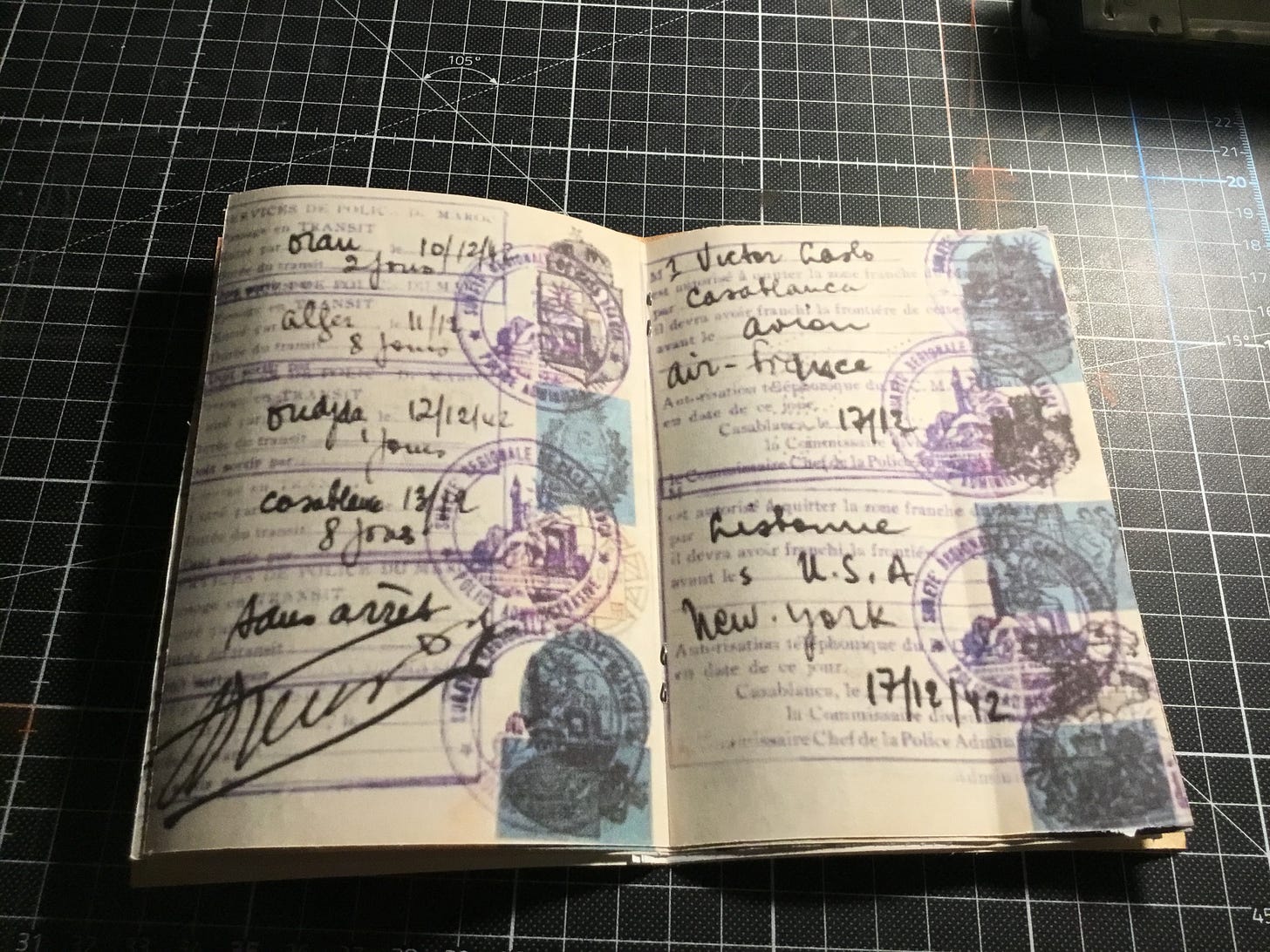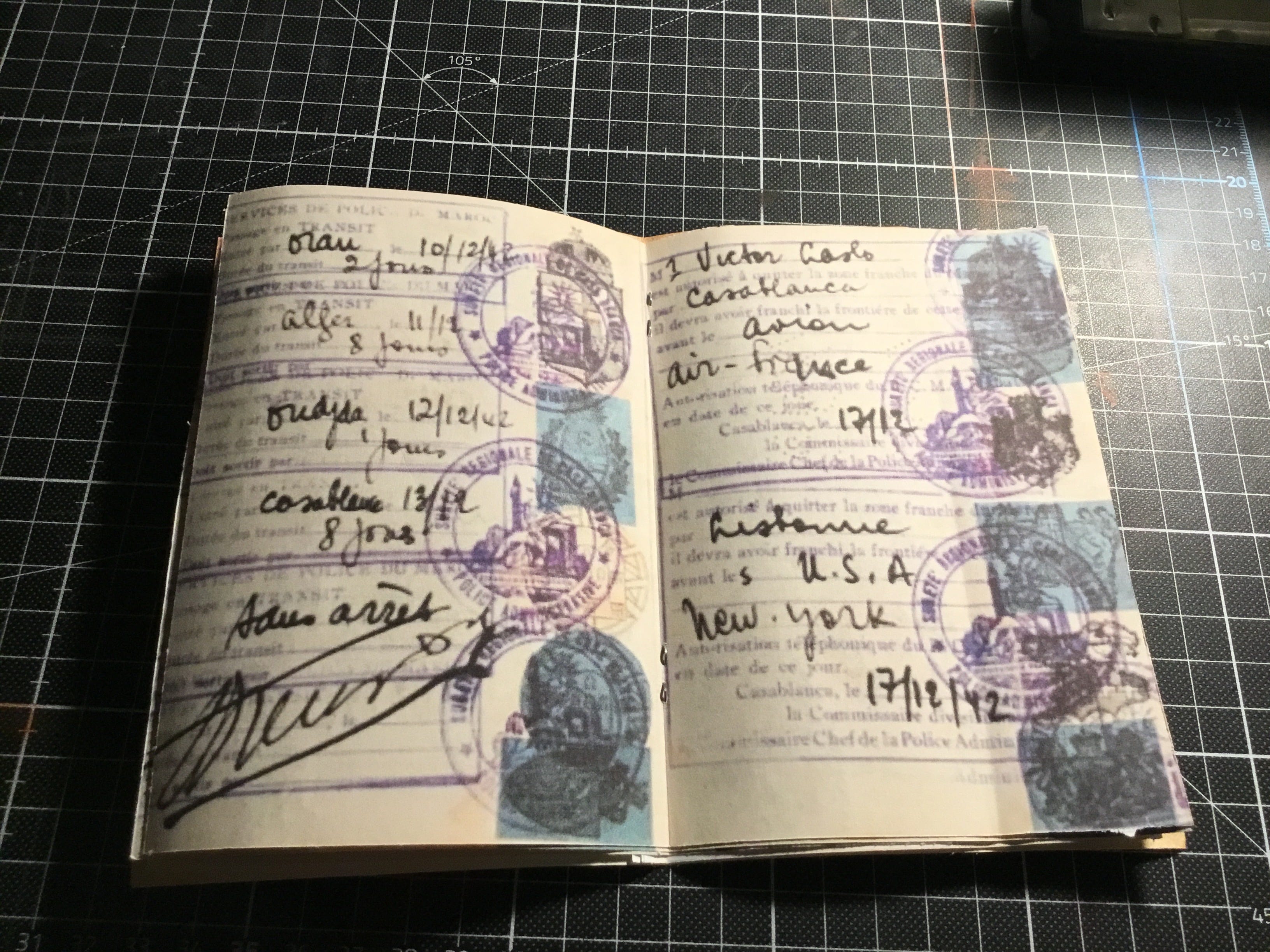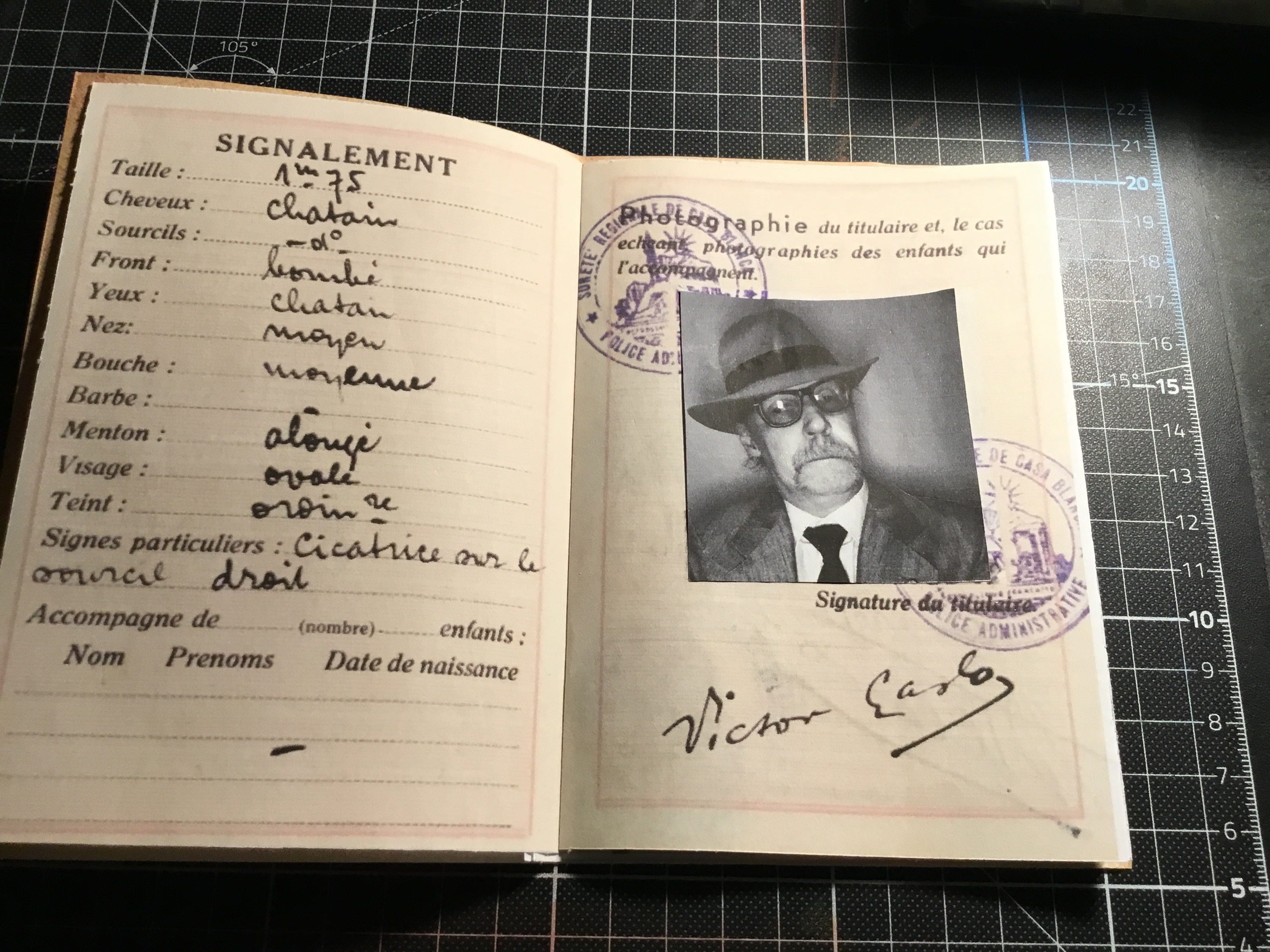 Did a movie prop French passport for Victor Laszlo. Did one this morning but that wasn’t good enough so I did one during the day. Found better paper of Parchment type for the cover, and did most of the original design, except for some decorative flower like symbols that I didn’t add. Also did a passport photo of myself and put there. Rather cool. As I’m in the process of growing a mustache I really got the detective look. I love this.
